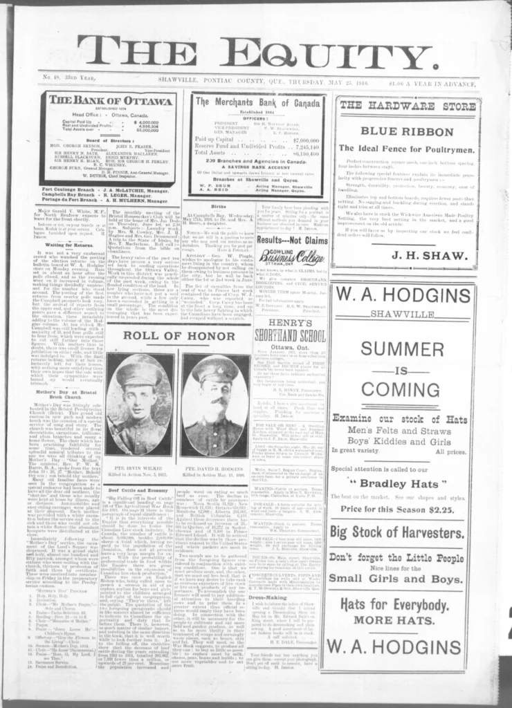 The Pontiac at War project was created to honour the men and women of the Pontiac who served during the Great War and beyond. At its heart, the project seeks to safeguard the region’s wartime history and ensure it remains accessible to everyone. Through this initiative, the stories of courage, sacrifice, and resilience that once filled the pages of The Equity are being brought back to life, connecting past generations with the present.