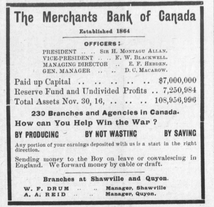 | Aug 9, 1917 | C. H. C. Greentree | Resigned as bank manager to enlist in an overseas Railway Construction battalion. |