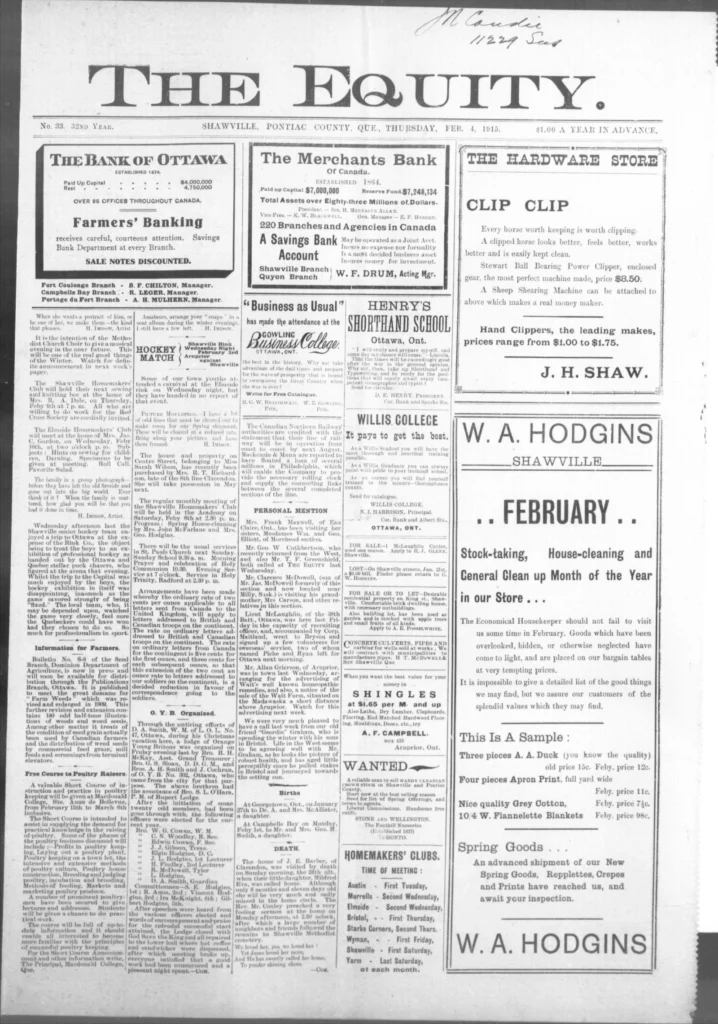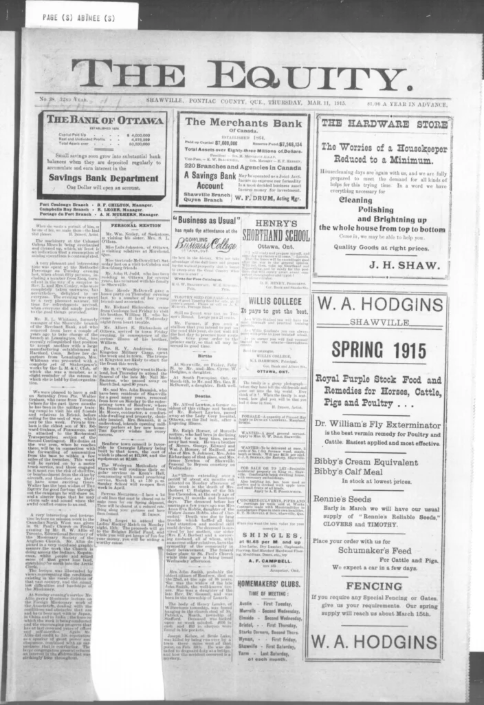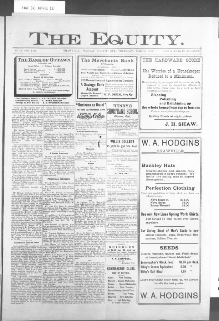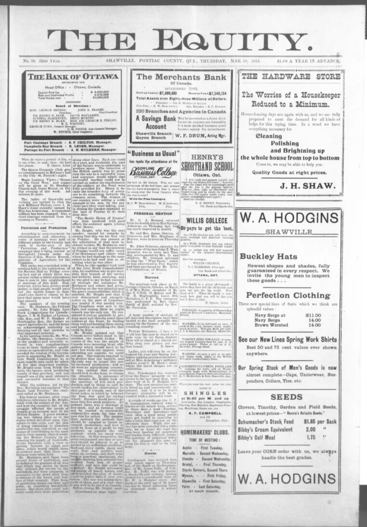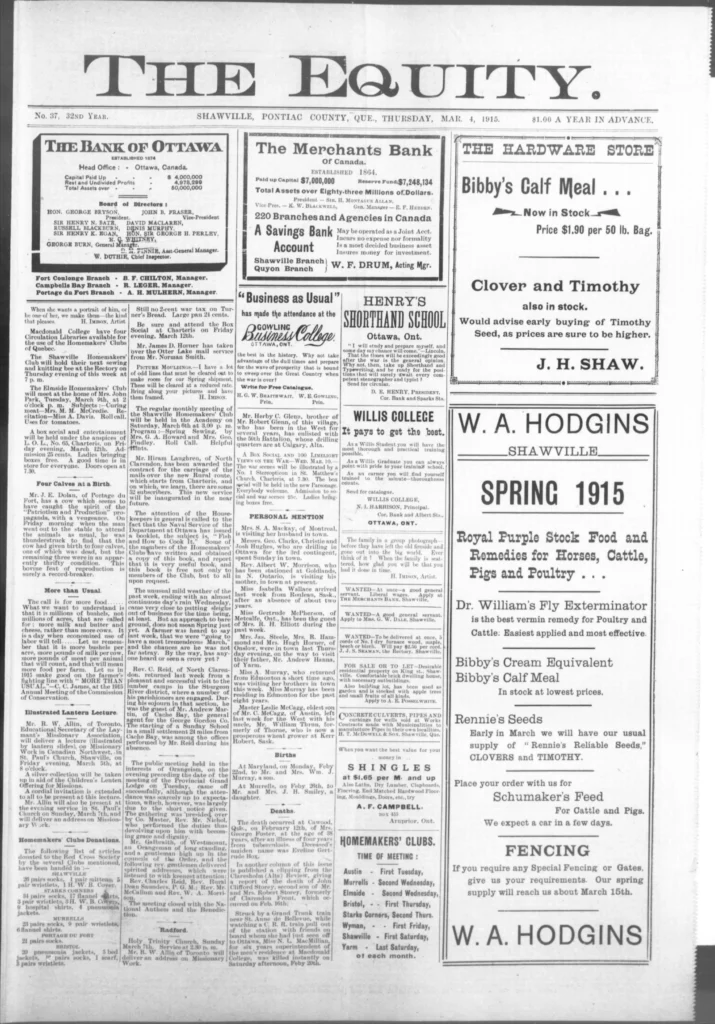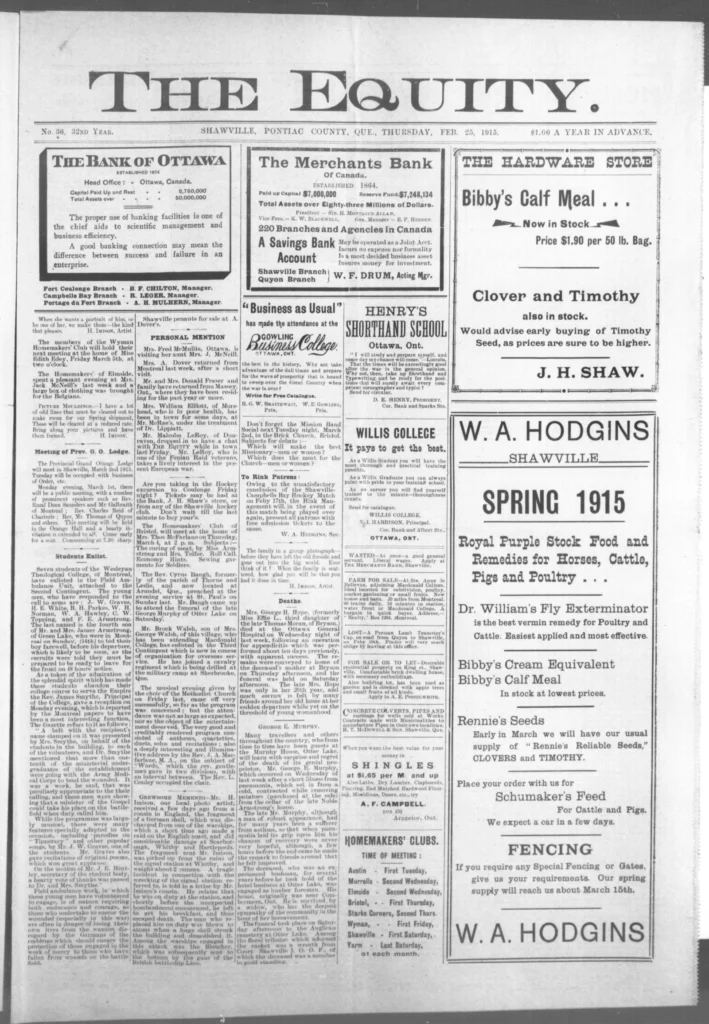 Men kept leaving. The recruiting notices still went up, and familiar names kept appearing on new lists — some from Shawville, some from as far as Campbell’s Bay. The Third Contingent was forming now, and the talk in shops and post offices turned to who would go next, who had written home, and who hadn’t. It wasn’t all battlefield glory anymore. One story in The Equity told of a young man, John Allan Valliant, killed not in France but here in Pembroke Township when his brother’s rifle went off by accident. The shock of it drove home a simple truth: danger wasn’t only “over there.”